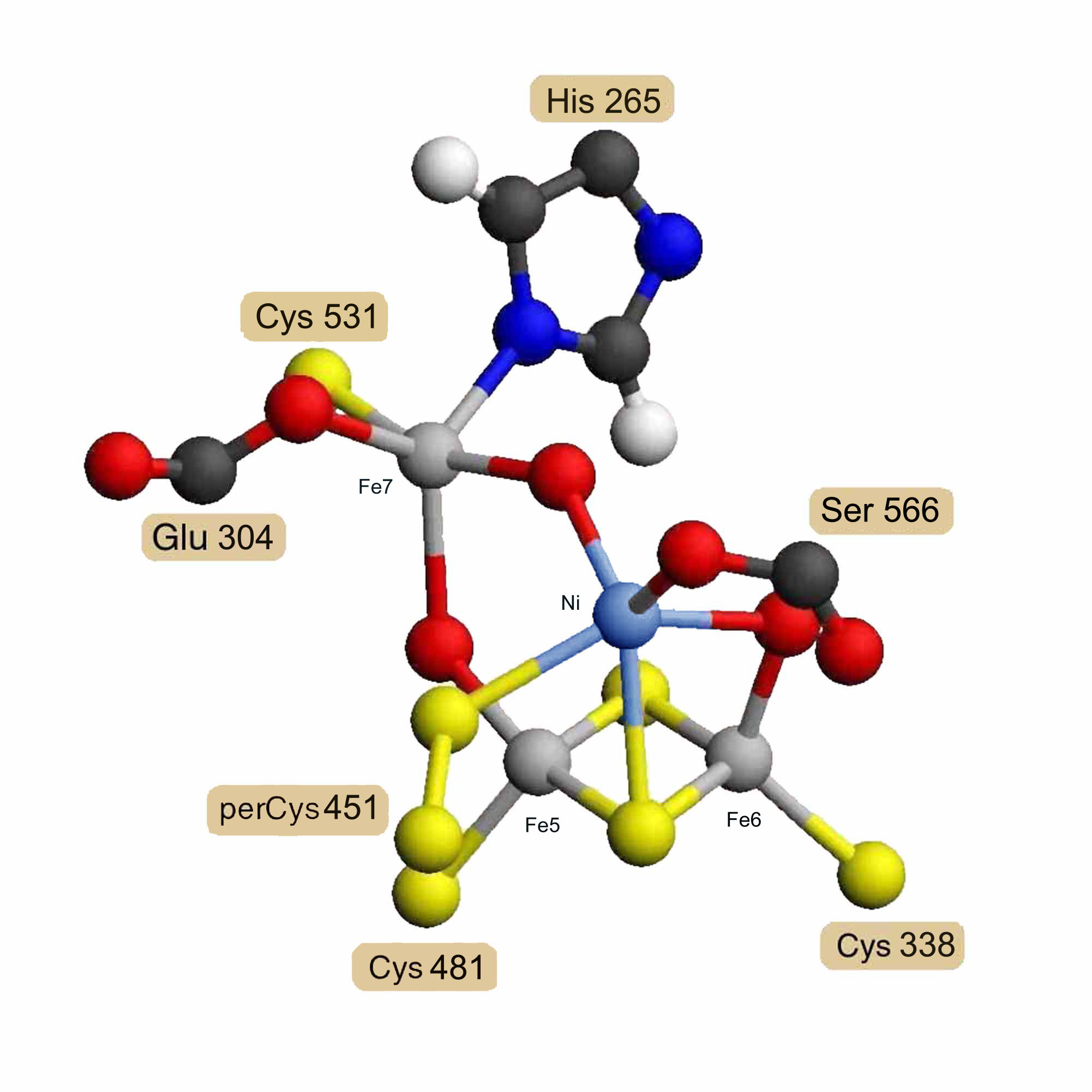 Assuming that the carbon-monoxide dehydrogenase beta chain is homologous, a model for its nickel/iron/sulfur cofactor was built as a hybrid [Ni-3Fe-2S-3O] cluster based on the hybrid [4Fe-2S-3O] cluster model. X-ray absorption spectrographic studies of the carbon-monoxide dehydrogenase beta chain of Rhodospirillum rubrum [13] indicate that the nickel is probably ligated by 2 sulfur atoms and 2 or 3 nitrogen or oxygen atoms. This means that the iron atoms labeled Fe5 and Fe6 would probably not be replaced by nickel, since they each have 3 sulfur ligands. The iron labeled Fe7 has 1 sulfur, 1 nitrogen, 2 oxygen and one other undetermined ligand, possibly carbon monoxide. The iron labeled Fe8 has 2 sulfur and 3 oxygen atom ligands, one of which would be from a serine residue rather than a glutamate in the Rhodospirillum rubrum sequence. While Fe7 cannot be ruled out if the undetermined bridge atom were a sulfur, Fe8 meets all the experimental criteria for replacement by nickel, and the model was constructed on this assumption. Coordinates for two alternatively ligated forms of the hybrid [Ni-3Fe-2S-3O] cluster model are available as entries RESID:AA0292 and RESID:AA0293.